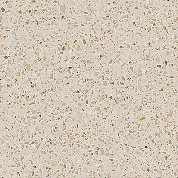 A creamy tan neutral interspersed with medium particulates of translucent brown, white, tan and silver glittery chips.